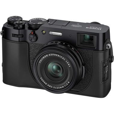 Custodia originale in pelle Fujifilm LCX100V, progettata per adattarsi perfettamente alle fotocamere Fujifilm X100V e X100VI, offrendo protezione elegante e funzionale.